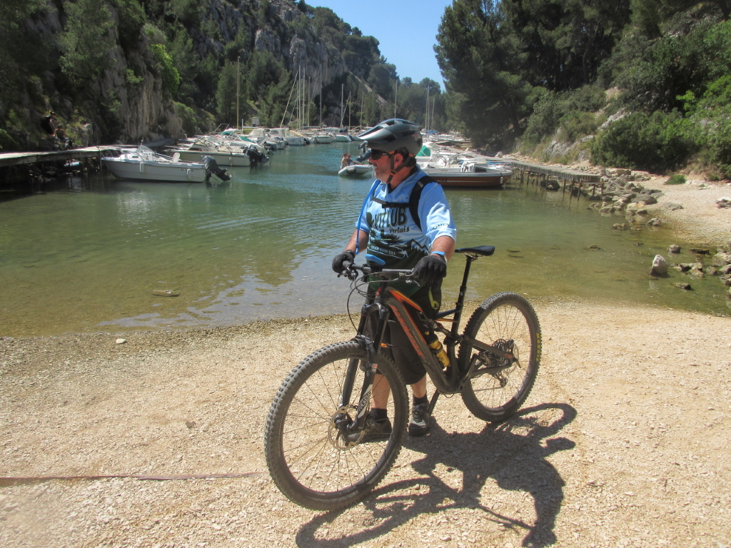 Nous nous trouvons déjà sur les hauteurs de Cassis. Nous prenons la D559 aussi appelée la route de la Gineste. Au parking, nous faisons une courte pause. L’ascension face au vent a été assez physique. Nous suivons alors une pépite : le ravin de Gorgue Longue. Qu’est-ce que la végétation a poussé depuis notre dernier passage ! Nous nous faisons lacérer bras et mollets. Seul, Loïc a préféré mettre le maillot du club aux manches longues. Lancé, je me fais arrêter net dans un virage par un rocher qui bloque ma roue avant et que je pensais pouvoir passer. La chute est inévitable, je tape le coude, le poignet et le genou (dans le désordre). La douleur est vive mais plus de peur que de mal. Au bout de cet étroit passage de 4km de long, nous débarquons sur l’entrée de la calanque de Port-Miou. Beaucoup beaucoup de monde. On dirait l’arrivée d’un TGV Paris-Marseille ! Nous nous rendons au point de vue puis grimpons les 150m de dénivelé jusqu’à la maison forestière de la Fontasse. De là nous continuons jusqu’au magnifique panorama situé au dessus de la calanque d’En Vau. Nous revenons un peu sur nos pas et nous nous lançons dans la descente technique du GR51-98 qui mène à la calanque de Port Pin. Ce sentier tortueux, au profil bien descendant par endroits, est technique à souhait. Nous composons avec les randonneurs, nombreux, en cette fin de matinée. Les échanges sont cordiaux. Etant premier, j’annonce systématiquement le nombre de vététistes qui sont avec moi. J’ai le sentiment que les marcheurs apprécient cette information. Je fais le lien avec l’antenne MBF Vaucluse récemment créée et dont le club est « partenaire ».