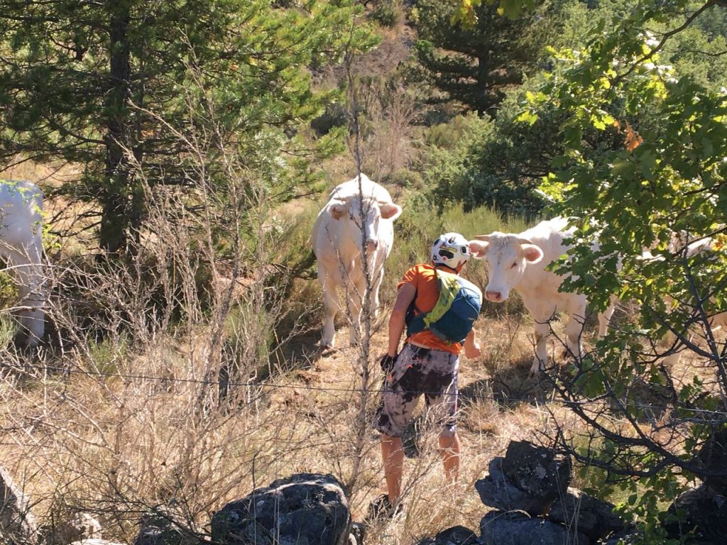 Nous remontons sur les selles, c’est reparti pour un tour ! Direction le centre-ville de Digne et son ancien hôpital. Dès le Grand Pont franchi, on part sur la droite puis sur la gauche. La pente est raide voire très raide. 17% indiquera strava lorsque les parcours seront téléchargés ! Et ce n’est pas la partie la plus facile, loin de là ! Nous sortons des maisons, le sentier devient étroit, très empierré et… infaisable sur le vélo. Il faut pousser plusieurs dizaines de mètres avant de retrouver des conditions acceptables. Plus haut nous tombons sur un parc à vaches où Thibault semble en extase devant ces belles personnes. Les bêtes, farouches, s’éloignent. Le chemin s’élargit, le sol est plus dur, plus accrocheur et nous suivons quasiment la courbe de niveau jusqu’à la route qui passe sous la zone de grimpe. Altitude 780 m. Nous avons pris 187 mètres de dénivelé en 3 kilomètres !