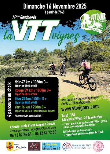 La 14ème randonnée VTT Vignes, projet fédérateur du club VTT LUB Pertuis, aura lieu dimanche 16 novembre 2025 au départ de Pertuis. Pour réduire l’impact environnement et garder un esprit « bon enfant », nous avons limité volontairement la jauge à 700 participants.